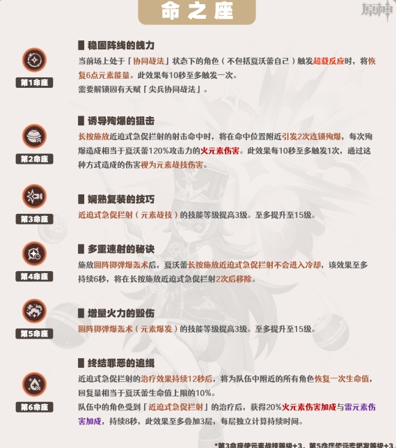 【6命】对于雷火辅助玩法的夏沃蕾而言提升最大的命座。配合战技的持续治疗效果为被治疗的角色(主要是场上角色)提供雷、火伤害加成。当战技的持续治疗结束后还将为全队进行一次治疗,该次治疗也可触发该命座的1层伤害加成效果(即后台可触发)。