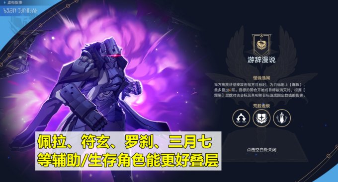 第一期的“游辞漫说”buff为释放终极技攻击敌方时,附上爆裂效果,并且最多可以叠6层。换句话说,进攻性大招越多,就会越简单。除了输出角色外,还有几个常用辅助/生存角色也很方便叠层:佩拉、符玄、罗刹、三月七等。
