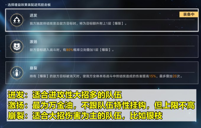 选择队伍时,还可以给每个队伍配备“荒腔走板”buff,总共有三种。这里推荐:第三种“崩裂”适合大招伤害为主的队伍,也就是银枝队;第一种“迸发”适合进攻性大招比较多的队伍,比如带佩拉符玄罗刹的队伍;第二种“激扬”最为万金油,不用和队伍特性挂钩,不过上限不高。