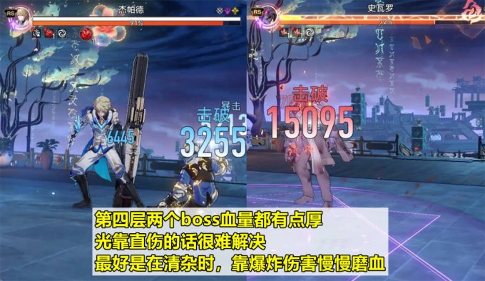 前三层哪怕是逆属性,练度到位后满星还是不难的。关键在于第四层,两个boss杰帕德和史瓦罗血量都有点厚。最好的办法是通过爆裂效果,在清理小怪的同时,给boss慢慢磨血,然后顺带解决掉。当然,即使上下半都解决不掉boss,同样可以拿到满星所需的6W分。