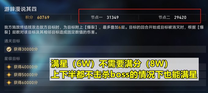 总共只有4层,同样分上下半。和混沌回忆不同的是,虚构叙事的小怪相对好击杀,应该是为了更好迎合群攻角色,还有对应的buff机制。上下层限制轮数均为为4轮,全打满总共8W分,但是满星只需要6W分;因此只追求满星的话(满分没有额外奖励),可以上下各只打3W,或者上半4W下半2W这样来“逃课”。