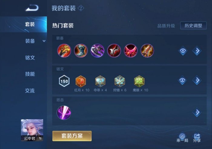 新版本因为二技能可以远程输出,所以出装上就考虑攻速暴击路线,就有一点当射手玩的意思了。很多人可能会问铸梦逐风会不会更好用?这件装备确实很适合新版本的云中君,但是新版本比较吃冷却缩减,没有大招打不了架,冷却缩减拉不满二技能的真空期长不利于打持久战,所以综合考虑还是选择了暗影战斧。