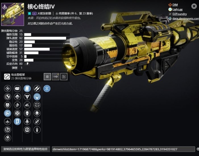 电属性,攻击型框架火箭筒,最多10发备弹,武器面板:高弹速,高填装速度,S23终愿赛季推出的T0火箭筒,【热血上头】的上位存在(【核心终结】攻击框架天生适合站桩输出,【热血上头】需要卡小丑皇才能同样10发备弹,但是没增伤perk,核心赢麻了),perk组合实在太多,我分类来讲
