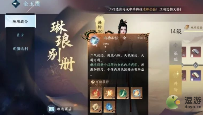 3、战令:在琳琅战令里面战令进阶的话也可以获得好几个的金色内功