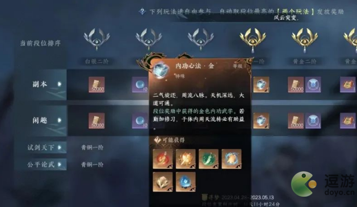 5、段位奖励:在段位奖励里面,琼玉三阶、五阶奖励有金色内功。