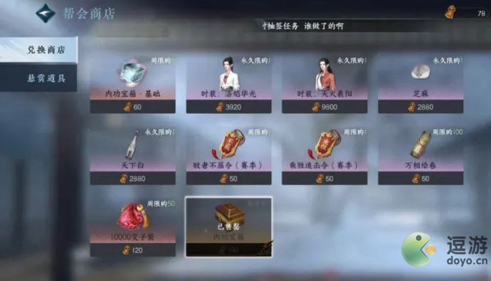 2、帮会商店:回春馆达到4级的时候,每周可以限购3个内功宝箱,可以开出金色内功