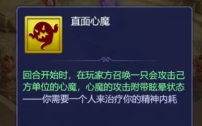 直面心魔:回合开始时,在玩家方召唤一只会攻击己方单位的心魔,心魔的攻击附带眩晕状态。