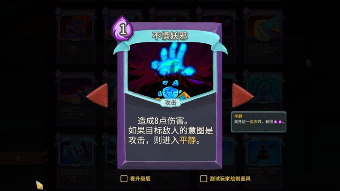 还有一种特殊情况,当前期没有其他状态切换牌,抽牌阶段手中同时抽中暴怒以及警惕时,一定记住要在回合结束后保持平静或无状态,不然在下一回合很大概率抽不到想要的状态转换牌,从而而导致损失太多不必要的血量从而导致在boss战的时候折戟。