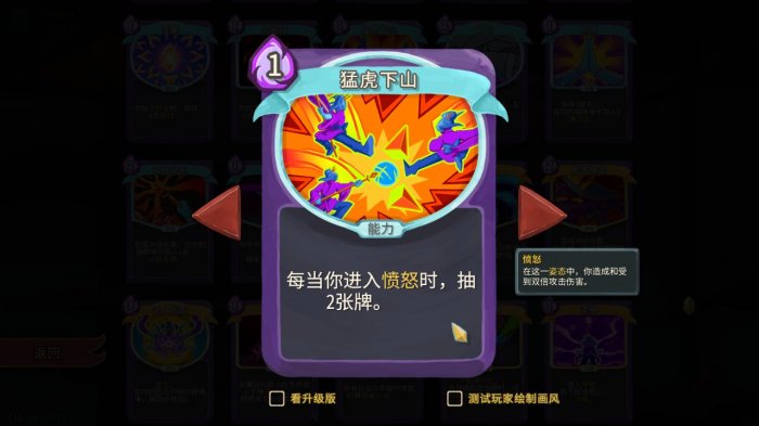 观者神卡!有必拿!无论什么职业,过牌都是十分重要的,猛虎下山作为一张过牌卡,升级之后变成0费,直接相当于白给。进入愤怒状态下可以过牌两张,在状态的不断切换下源源不断的补充攻击卡,和退出平静状态获得两点能量相辅相成,这张卡就是观者攻守一体的基础。