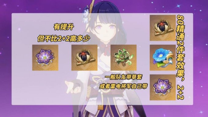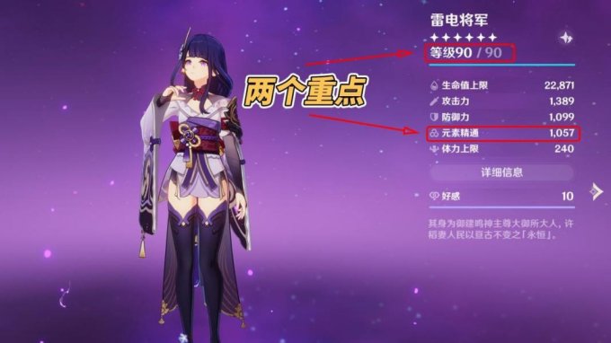 雷电将军此时只需要注重2点,自身高等级+面板高精通,其余的天赋等级、双爆数值之类通通不重要。