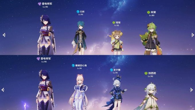 【高配】雷电将军+心海+芙宁娜+纳西妲。4C体系,全员皆为输出角色,且辅助能力相互搭配共同提升,以高配置换取更强的输出。