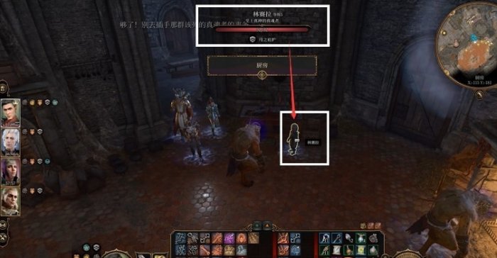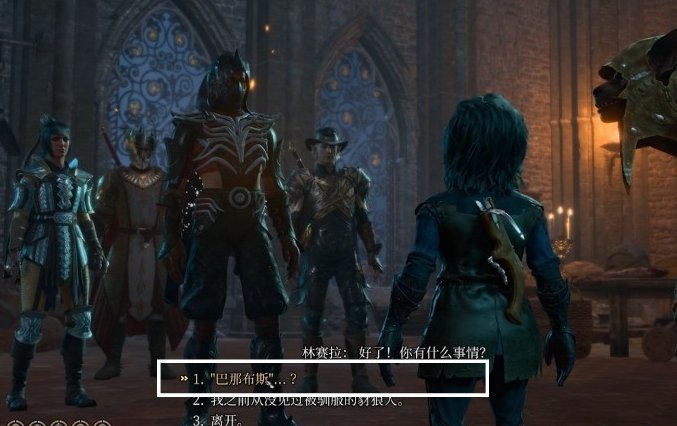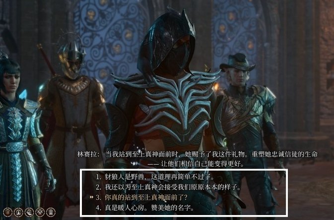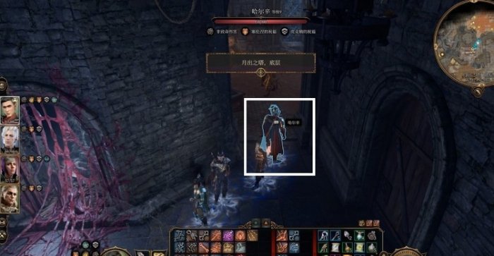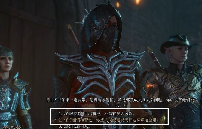 需要注意的是,更换哈尔辛后,出来会出现系统提示,需要我们选择是否要携带哈尔辛在月出之塔,选择选项12随意。由于第二章幽影诅咒和德鲁伊有巨大关联,这里如果直接带着哈尔辛在月出之塔闲逛是会被发现并进入盘查的,不过当前区域没有士兵,可以放心携带哈尔辛