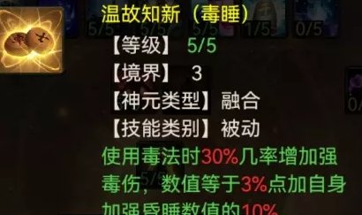 毒睡方向。有的小伙伴抱怨,新版4阶毒仙器这强睡30%的属性莫名其妙!别忘了,新天演策毒睡方向有个技能“温故知新(毒睡)”,就是有几率把身上的加强昏睡属性按照比例转化为加强毒伤害,虽然是几率,但是也是很珍贵了。