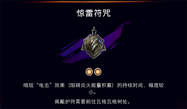 惊雷符咒的效果是缩短电击的持续时间,电击的效果是阻碍炎火能量的积蓄,这个符咒在面对有电击负面效果的BOSS可是能救命的。