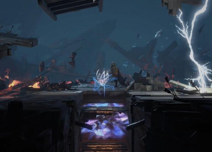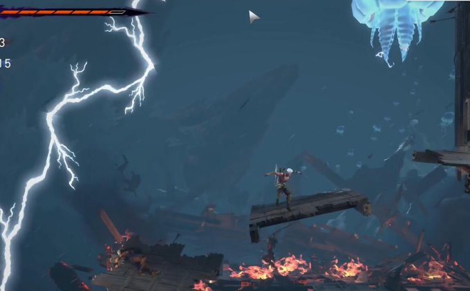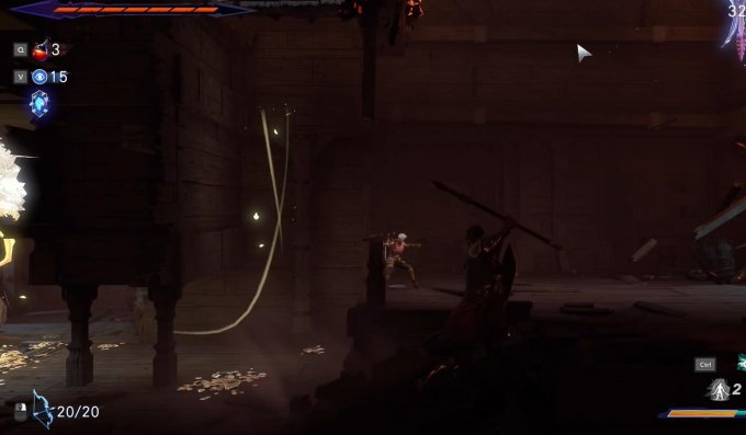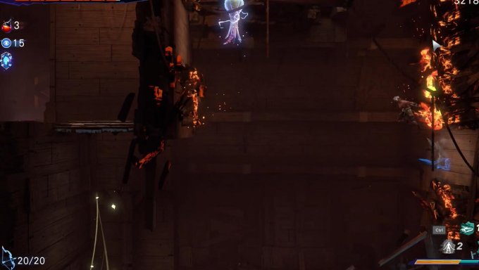 3.在右侧我们能遇到有很多水母的天井,优先将水母打掉,之后凭借二段跳或是空中冲刺,移动到墙壁上没有火的地方,借力跳到更高处。