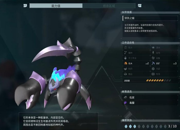 钢铁之蝎:与它并肩作战时,玩家的防御力会有所提升,若击倒雷属性的帕鲁,就能从该帕鲁身上获得更多掉落道具。
