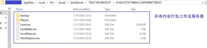 注:服务器上其实并不需要backup文件夹,因为据小编测试服务器上并不会自动进行备份。另外,如果想在服务器上单独进行设置,请删除WorldOption.sav,因为该文件会用原存档的设置覆盖服务器中PalWorldSettings.ini的设置。另外经测试,LocalData.sav似乎也不是必须的。