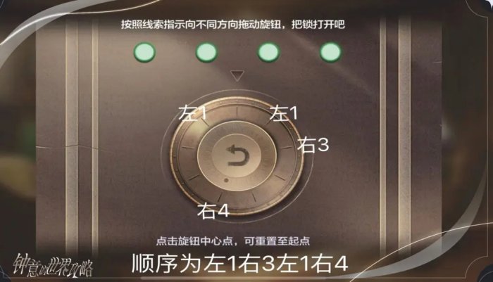 阅读→获得线索:“我的身份”→查看门→查看红酒杯→获得线索:左1右3左1右4欣赏画框→调查画框四周→移动→开锁→获得钥匙→开门
