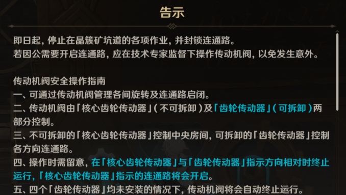 当我们寻找线索时却只发现了控制装置旁边的阅读,看完内容(如下图)后还是一脸懵,只知道大齿轮和小齿轮的指针相对就能开启对应的房间和旁边的小齿轮可以拆下来。