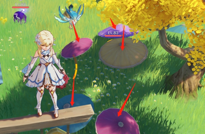 踩这些伞会出现不同元素的史莱姆,然后一个荒星下去。