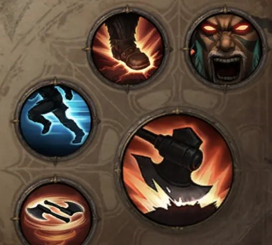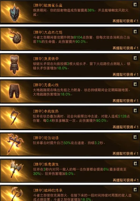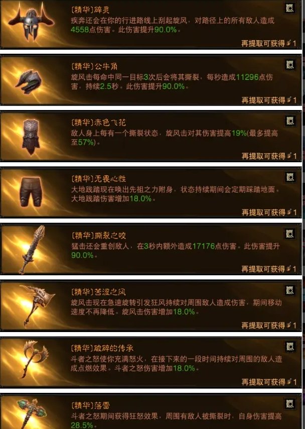 这套是野蛮人最常见的BD了,也是目前刷野打本最舒服的BD,开启疾奔全程风火跑图,疾奔带火带风、旋风击带风、斗者之怒带火,可以负责的说如果你有一定的持续时间加成全程风火助威是随便触发的。普攻选择了狂斧,主手增加攻速副手提升伤害可以说在全程AOE的BUFF下我们打BOSS也依然有一战之力!
