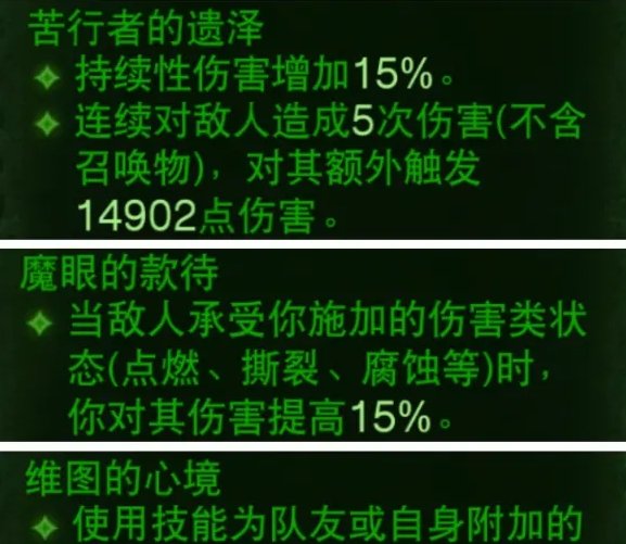 套装推荐2维图+2魔眼+4苦行,因为全程有点燃状态所以4苦行+2魔眼是把伤害类状态拉满的最完美套装,而2维图是这套玩法的基石,哪怕2魔眼4苦行没有凑齐也要先把2维图凑齐来,因为2维图的加成可以给到疾奔、斗者之怒、大地践踏。