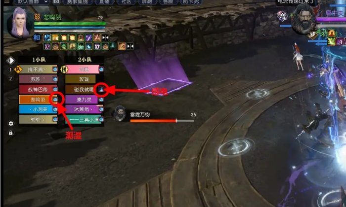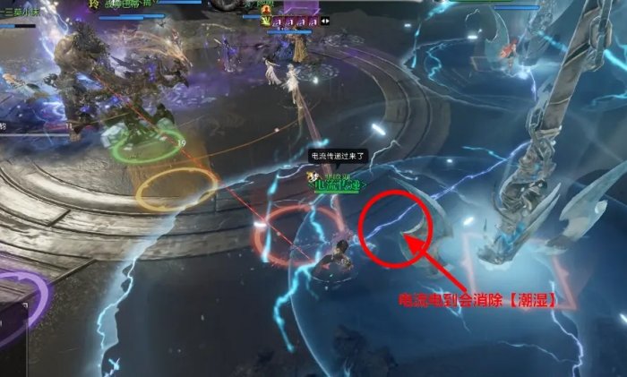 ③潮湿状态清掉后,还会获得一个【感电】状态,周围会有一圈雷电,可以给队友造成伤害。需要清除潮湿后,在附近等待雷圈消失再回大团。