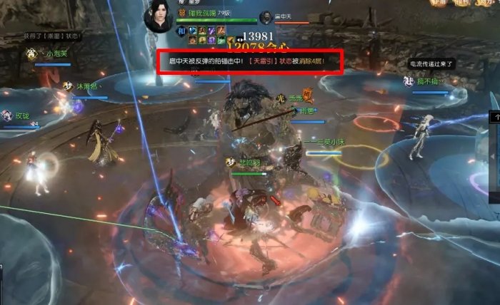 机制效果:BOSS进入天雷引状态,倒计时结束击杀场上所有人。需要用4档电流击中BOSS才能破除。每有一名玩家连电,电流增加1档,也就是最低需要4名玩家。
