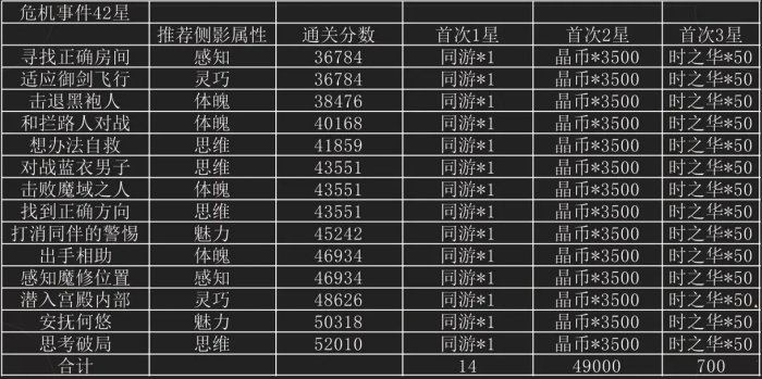 危机事件(42星)+资料收集100% 本副本剧情选择不影响资料收集,跟随剧情及可完成,一共14个危机事件(数值如图),完成该主线后可以在身份回廊解锁身份卡牌-江河日月,升级可以获得对应侧影属性提升。
