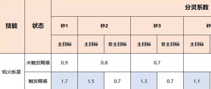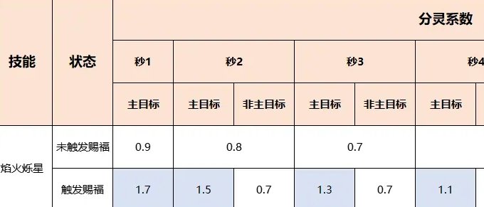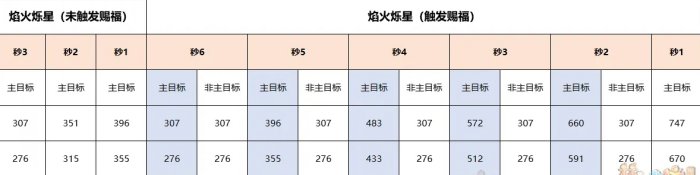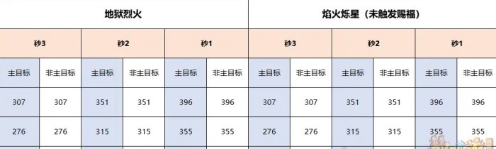 根据对比结果可知,在未触发赐福时,【焰火烁星】伤害与召唤兽群法一致,对主目标无额外伤害效果。