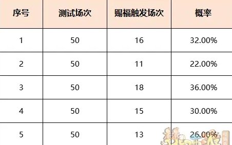 综合5组数据可得,【焰火烁星】触发赐福概率为29.2%,考虑到梦幻西游内置概率多为整数的倍数,因此猜测【焰火烁星】触发赐福概率为30%。