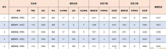 调整超级神龙(甲辰)法伤及等级获得多组数据,确定结论准确性。