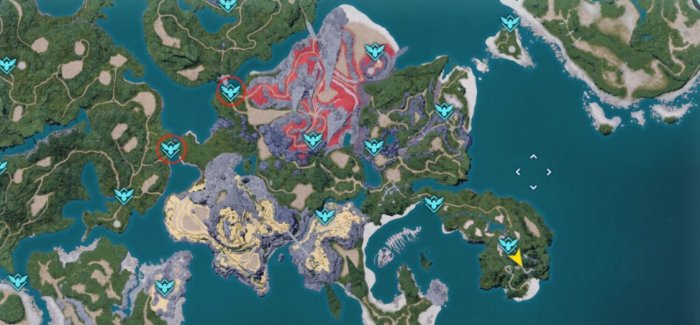 《幻兽帕鲁》初始拥有8个复活点,按照地理环境,主要分为西南的火山、北边的雪山、东北的沙丘,以及中部众多的丘陵平原岛屿(下图为笔者将上下两半拼接后的完整地图),玩家可以通过巨鹫之像(传送点)或据点(最多3个)进行传送!
