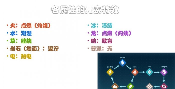 除此之外,每个属性的技能还会造成异常状态特效,大多数玩家在游玩中也都遇到了。比如火系技能会挂灼烧,水有潮湿,雷有触电,草有缠绕,冰会冻结,岩石系有泥泞,暗系会致盲龙系目前看来也是点燃,跟火系似乎没有什么不同。