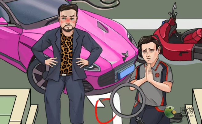 5、点击后方中间的加油机,再拖动放大镜到车底下,发现漏油