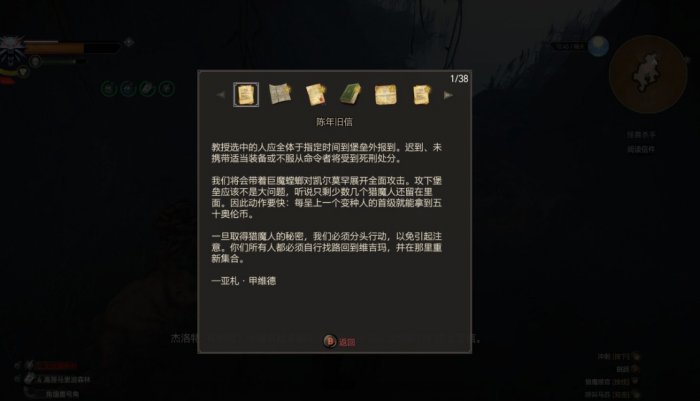有一封有关巫师一剧情的信。内容是巫师一中火蜥蜴帮攻打狼堡的计划。了解过一代剧情的玩家会听懂杰洛特在说啥,没有了解的话会一头雾水。