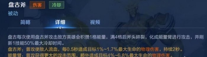 先了解他的被动技能,每次使用盘古斧都会积攒1个能量,4个能量后斧头会化成能量手臂进行攻击,还能刷新1技能50%的冷却;