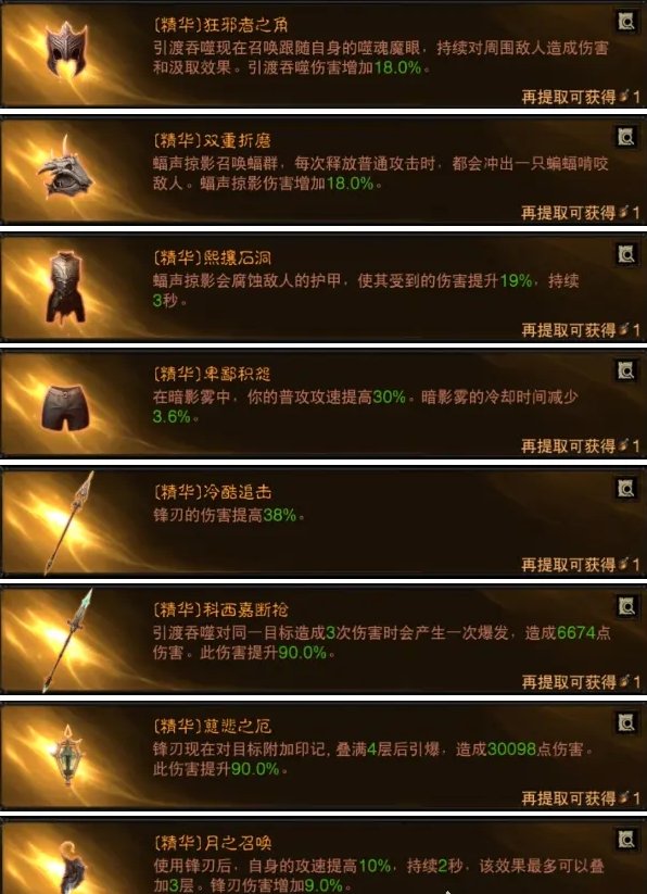 技能有潜行怒袭一个位移技能就够了,不带无畏挑击让普攻更加丝滑,同时放弃了蝠群代言人换成双重折磨强化普攻,头部留一个狂邪者之角+主手科西嘉断枪来提升引渡吞噬的伤害,也能少量吸血。主要的核心是普攻锋刃、主副手3个精华给到了锋刃输出提升,护肩也有普攻带蝙蝠