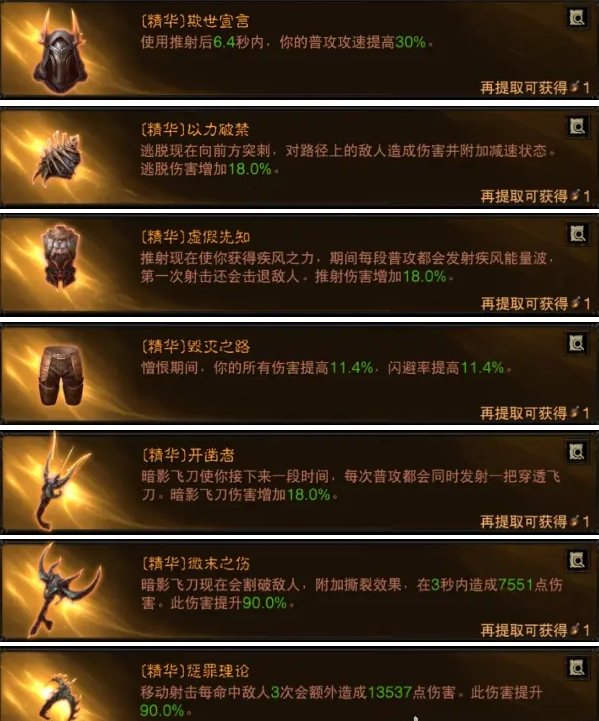 BD精华主手是一样的,所以不重复贴图了,这套的特点是拥有逃脱的小位移来躲BOSS技能,利用推射+憎恨+飞刀的BUFF进行输出,一直远程拉开距离打伤害,副手选择惩罪理论来打持续伤害。主手依然是开凿者,梦魇5的BOSS还是有点灵活的,如果用爆炸箭会很不舒服。