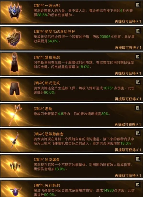 利用黑洞增伤搭配普攻不停消耗,搭配洪流+闪电新星的普攻BUFF输出即可,相比法师其他BD来说这套打一些笨重的BOSS持续输出要高不少。护肩没有选择传送加速而且给了传送护盾,本身传送就足够躲避技能了,这要搭配让我们拥有更高的容错率。