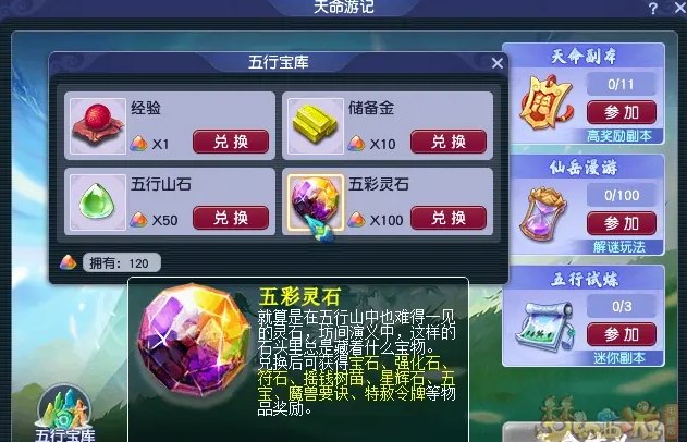 五行之力最多积累500点,可以在五行宝库中兑换经验、储备金、五行山石和五彩灵石。其中,五彩灵石还有几率开出摇钱树苗、五宝、魔兽要诀、特赦令牌等奖励。