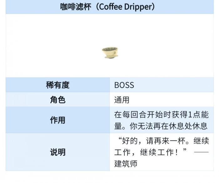 因此我的抓取建议是,只要你的卡组不是非常非常地菜,很容易造成大战损的卡组,相对稳定一点的卡组,都可以抓取咖啡杯,在我的眼里咖啡杯基本相当于无损加费。另外在有带骨肉或者鲜血雕像等能回血的遗物时,咖啡杯基本能无脑带。