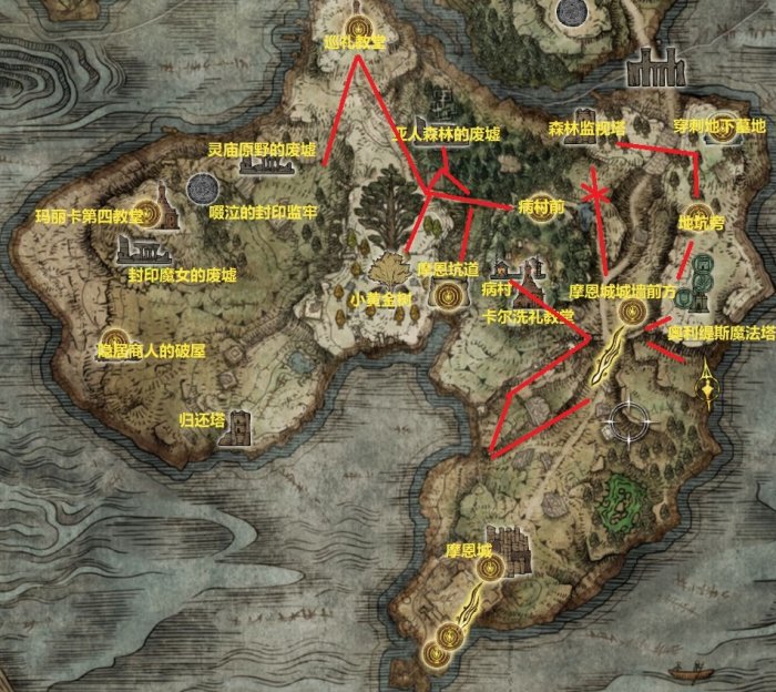 建议先从该地图的部分地下洞窟和封印监牢入手。例如蒙流洞窟、海岸洞窟、无主猎犬的封印监牢以及风暴山丘的封印监牢。这些地方可以掉落部分武器装备,有些甚至可以用到大后期(例如猎犬长牙)。等拥有一定的等级和装备后,再去挑战大树守卫。