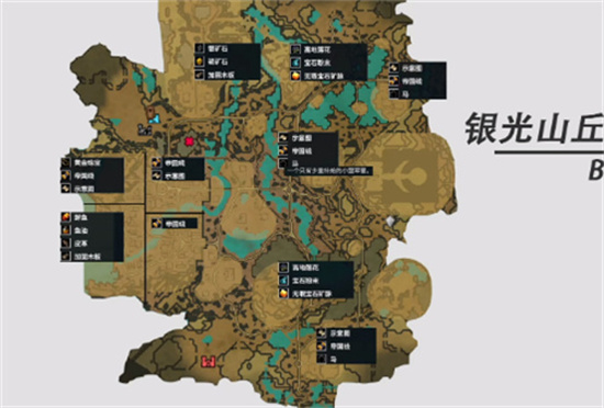打开游戏地图,可以在游戏地图的左上角银光山看到一个待开发的区域,这个区域就是神圣银矿,在这区域内,玩家可以开采适量的银矿、银锭。想要开采这些银矿、银锭,需要拥有无情铁器级别的武器,才能够获取神圣银矿中的金属。