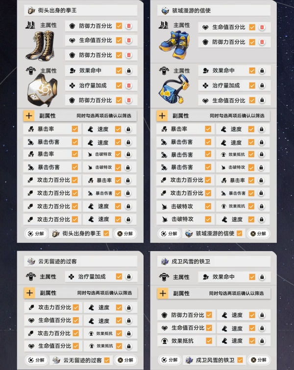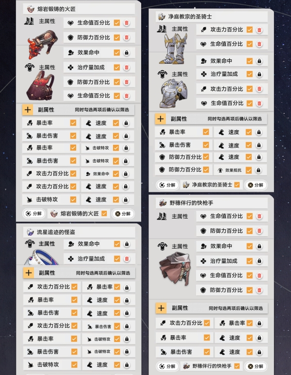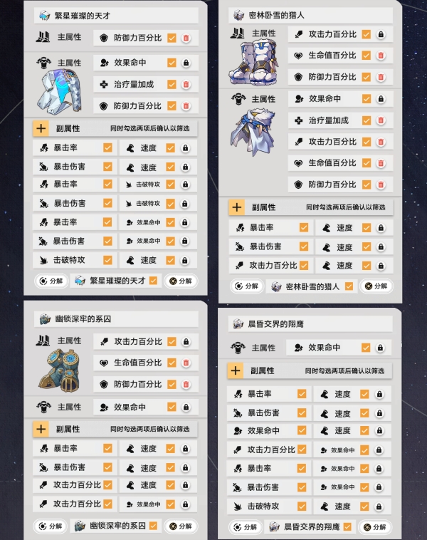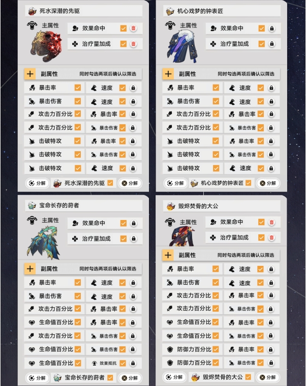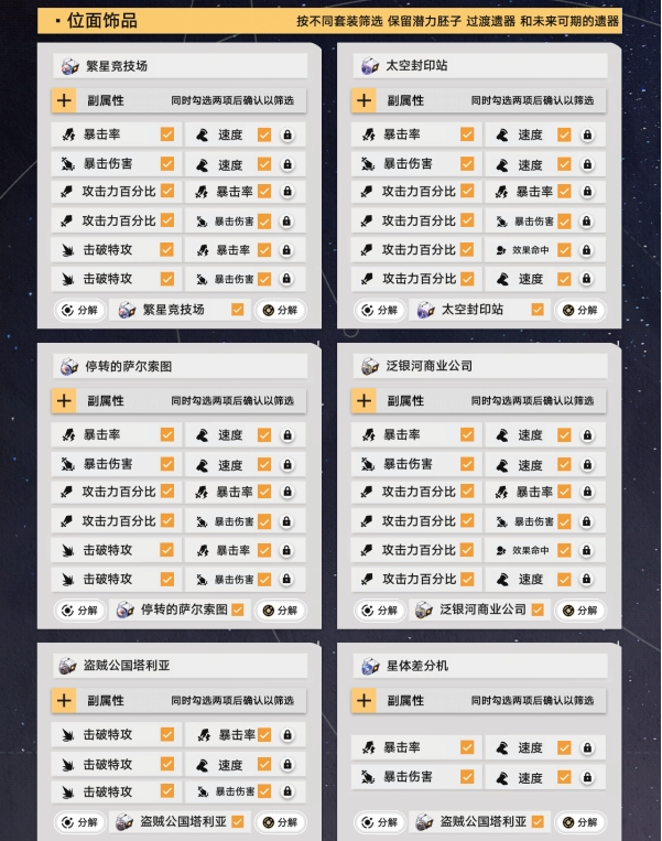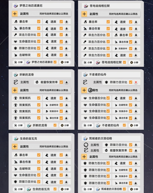 接下来按照上面的步骤来操作锁定需要的遗器,最后把筛选淘汰的遗器全部分解就可以啦。