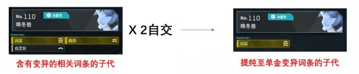 将①所得两只高个体值、含有变异词条的唤冬兽提纯自交,获得仅含有变异金词条(脑筋、凶猛)的唤冬兽。