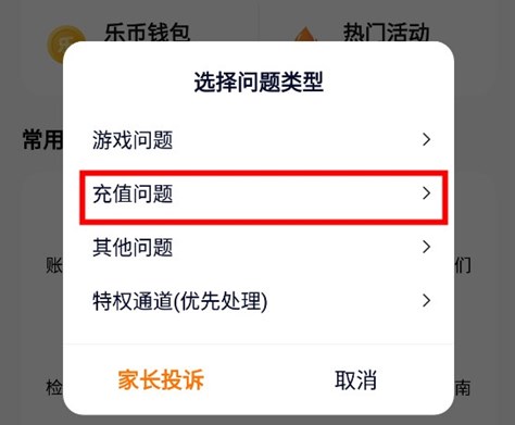 3.接着在系统弹出的问题类型中选择【充值问题】,点击前往客服对话框;