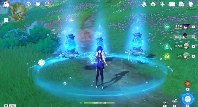 1.收集小水珠后先移动高处的机关,随后从旁边传送圈快速移动到低处,移动机关,使用水环同时激活这三个机关即可完成解密,开启宝箱后萨沙会出现。