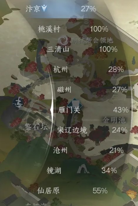 在以下地图探索度满一定数值后即可领取分别是:桃溪村380点/三清山175点/汴京370点/杭州330点/磁州300点/沧州260点/东极海500点/镜天阁450点。