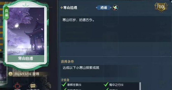 红袖刀任务中有个成就【寒山拾遗】,寒山拾遗总共10个小成就,全部在小寒山完成,接到任务来到小寒山,任务到追风这里温柔去找师兄,任务提示可以在小寒山逛逛,这时就可以开始做成就了,首先花簪遗失,在坐标80,459,空药葫芦在坐标40,470角落,旧药方在坐标44,477,追风翼图纸在坐标41,482角落,木刀在坐标45,488,拾取触发对话,练刀在地图中间坐标92,499,寒山诀在坐标144,455,奉辉往事在坐标53,538亭子下面,剑门山之乱在坐标57,537,蜀中之行在坐标143,481。